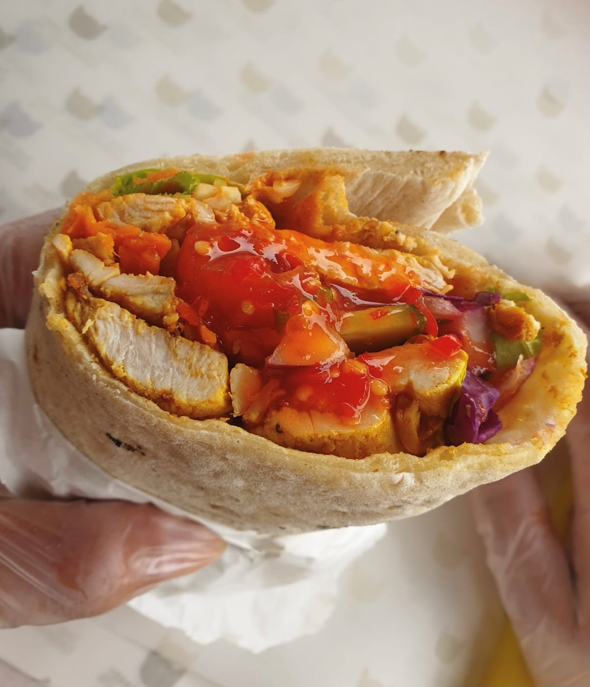 Tender slices of chicken breast in a yoghurt marinade Served with our selection of salad and sauces either open or rolled and wrapped
